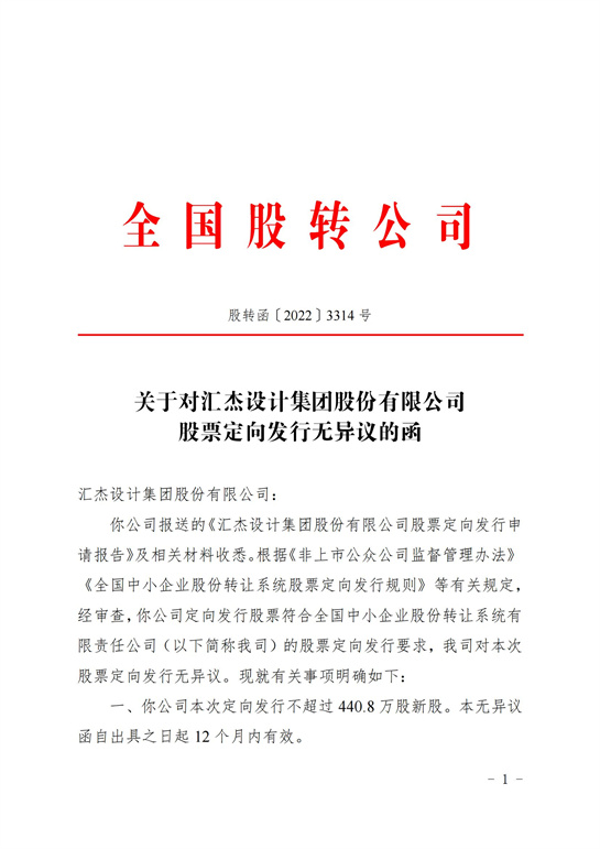 關于對匯杰設計集團股份有限公司股票定向發行無異議的函